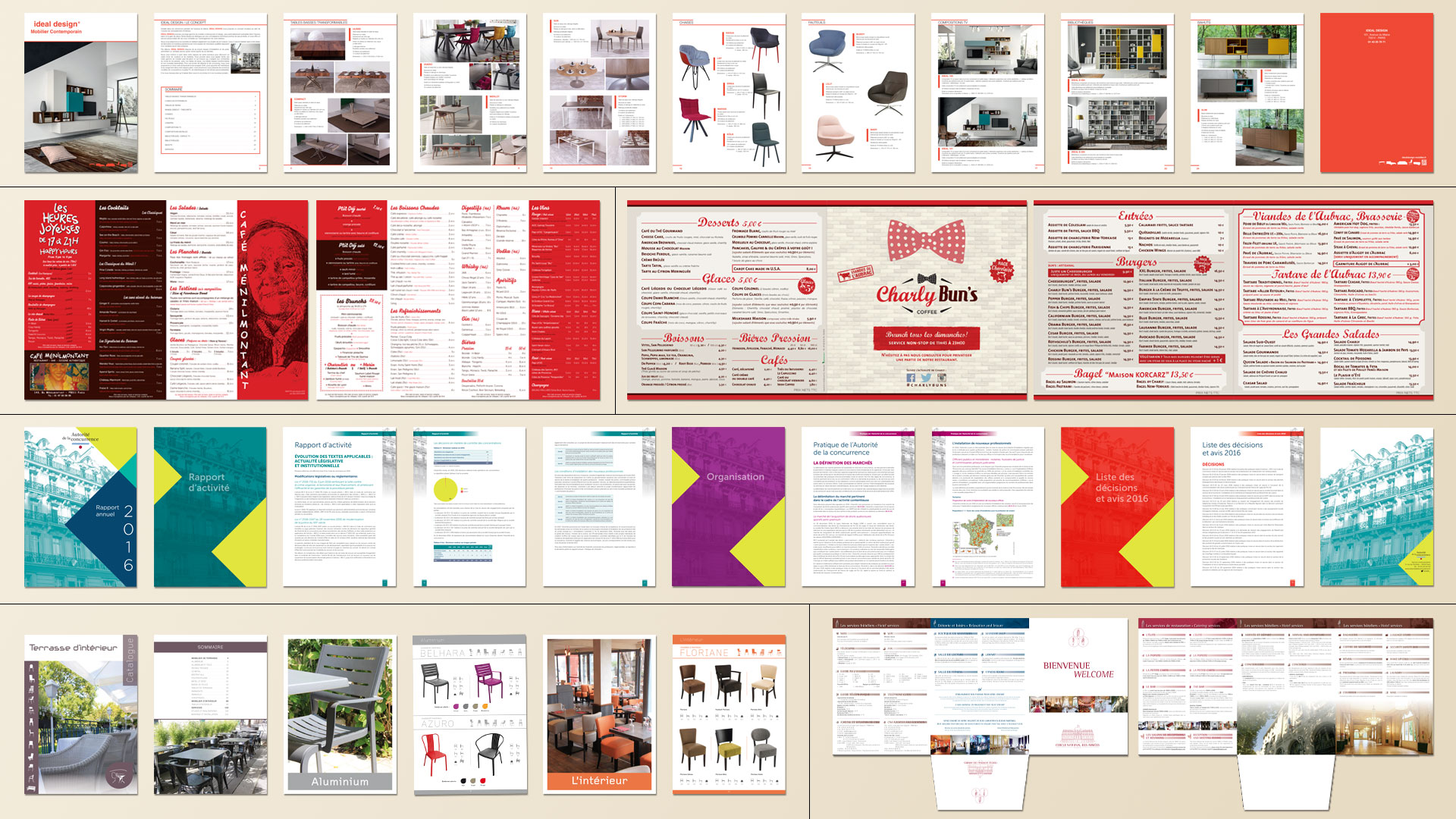 Voici quelques exemples de mises en pages réalisées, il s'agit de brochures d'ameublement (pour la boutique Idéal Design et la société Terrasses d'Intérieur), d'un rapport d'activités (pour l'Autorité de la Concurrence), de menus de restaurant (pour le restaurant Charly Bun's et la brasserie Café Ménilmontant) et d'une pochette à rabat (pour l'hôtel Cercle National des Armées). Ces mises en page ne sont qu'un très bref aperçu de l'ensemble de mes réalisations. Veuillez excuser la faible résolution de cet aperçu mais j'étais contraint de ne pas dépasser la taille maximale de 512Ko.