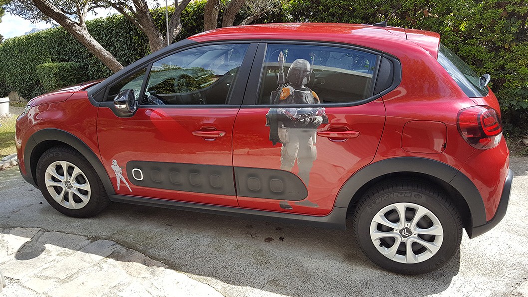 Décoration véhicule en vinyle micro perforé et polymère. Réalisation des illustrations et des fichiers en haute résolution pour l'impression et la découpe.