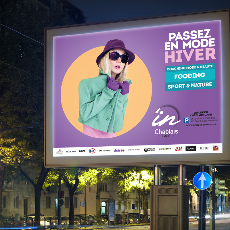 Création de la nouvelle campagne d’affichage Été / Hiver et d’outils de street marketing pour le centre commercial Chablais Parc.