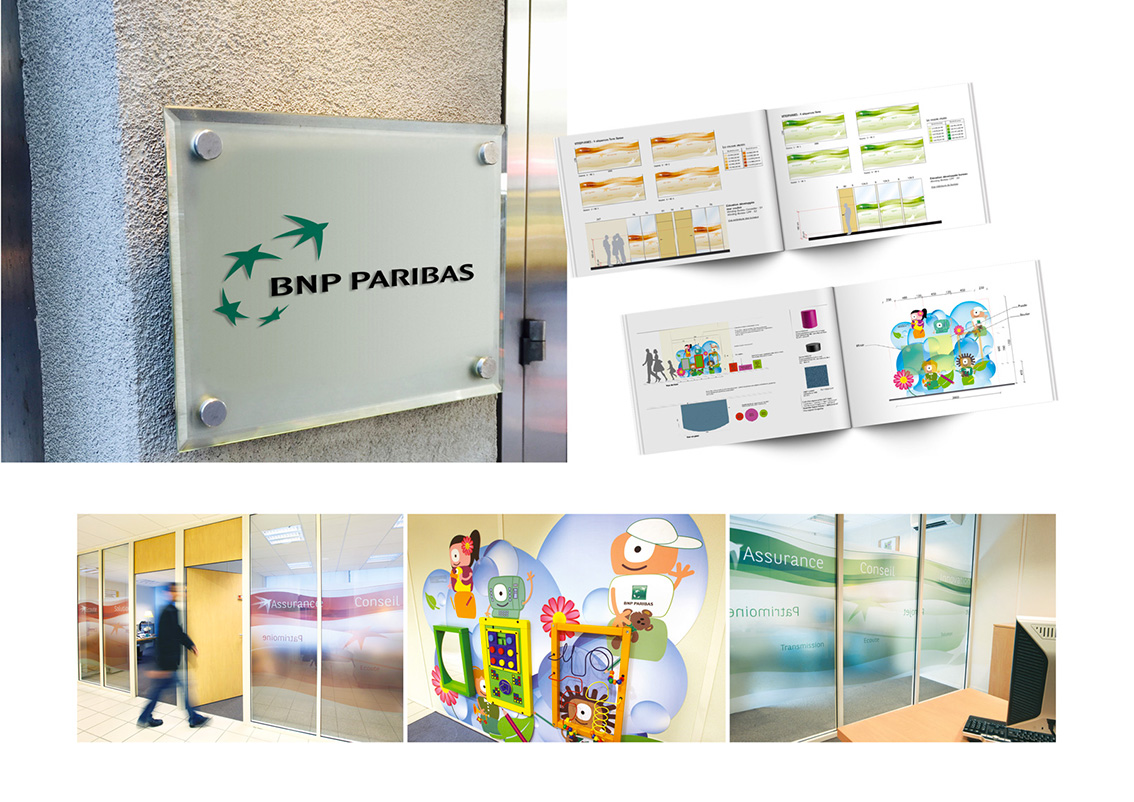 Réalisation d'un cahier signalétique du Concept Accueil & Services destiné aux agences bancaires : signalétique, décors et vitrophanies. Tests numérique pour choix des supports et couleurs, réalisation de tous les fichiers pour fabrication + Suivi Client/Fabricant. Site pilote : agence Paris Boulevard Sébastopol.